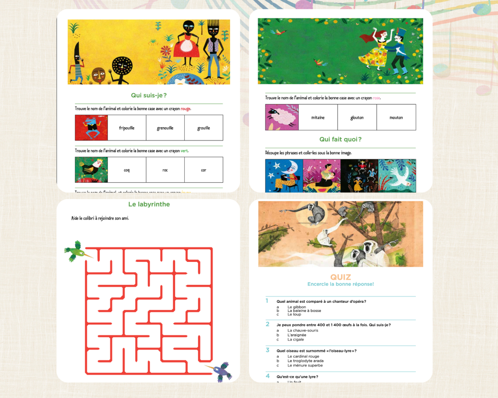 Offerts en deux niveaux, soit pour les 4 à 6 ans et les 7 à 9 ans, les mini cahiers permettent aux enfants d’apprendre les nombres, les lettres et le nom des instruments, ou encore de développer leurs habiletés de lecture. Le contenu de chaque mini cahier s’inspire d’un album musical publié dans le catalogue de La Montagne secrète.