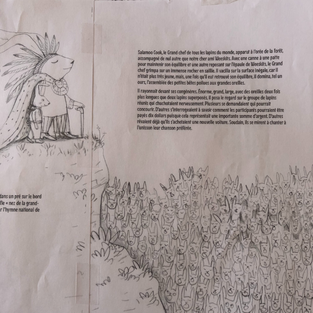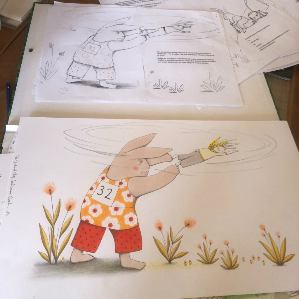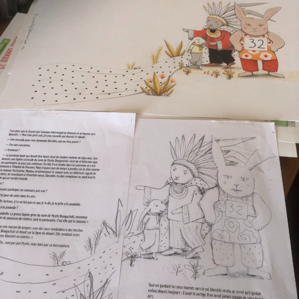 Puis vient le travail des crayonnés, la recherche des personnages, du rythme visuel, des ambiances colorées, la pose des décors, le rapport texte/images, les éventuelles corrections des crayonnés…